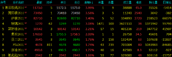 2025年9月25日,国内期货主力合约多数上涨。集运欧线涨近4%,国际铜、沪铜、玻璃涨超3%,菜油、焦炭涨超2%。跌幅方面,沪金、棉花、橡胶、20号胶(NR)、生猪小幅下跌。